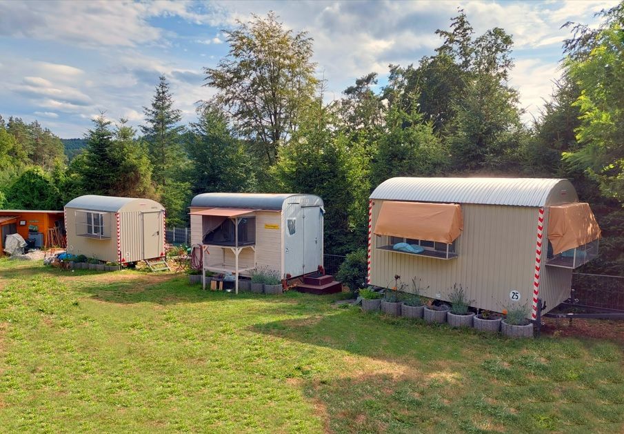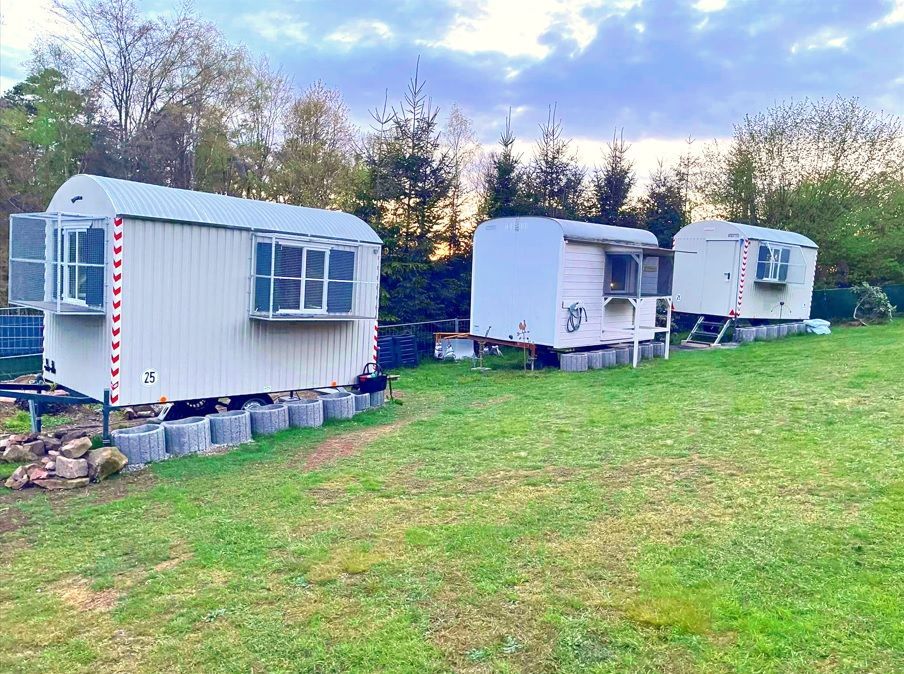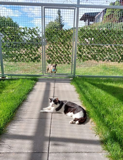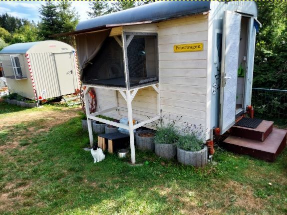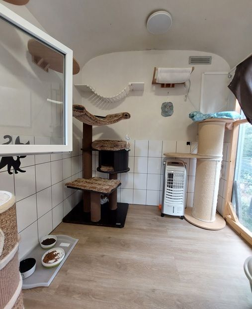 Wir haben inzwischen 3 Bauwägen, die komplett zu Katzenhäusern inkl. Balkonen umgebaut wurden, einen Wohncontainer mit einem Freigehege und genug Platz für 10 Katzen, eine Krankenstation mit Quarantänebereich und unsere ehemalige Hasenhütte, die wir vollständig katzengerecht umgebaut und auch mit einem kleinen Außenbereich versehen haben.