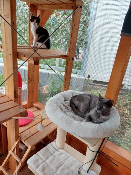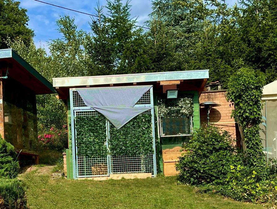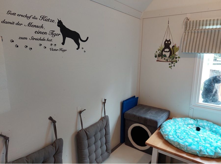 Wir haben inzwischen 3 Bauwägen, die komplett zu Katzenhäusern inkl. Balkonen umgebaut wurden, einen Wohncontainer mit einem Freigehege und genug Platz für 10 Katzen, eine Krankenstation mit Quarantänebereich und unsere ehemalige Hasenhütte, die wir vollständig katzengerecht umgebaut und auch mit einem kleinen Außenbereich versehen haben.
